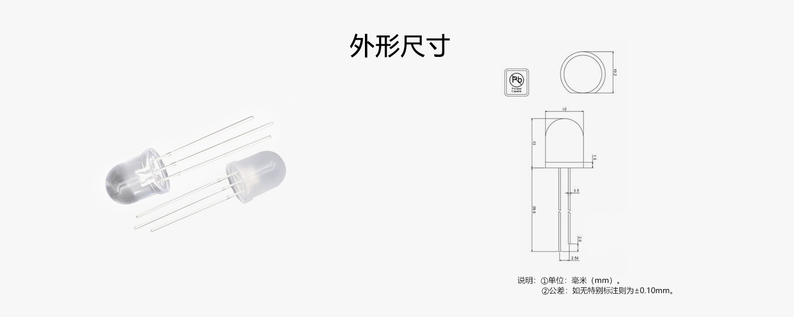 | 10mm 圆头双色(红绿) | AAV | 10*13.7 | 红光 Red | 620-630 | 100-7000 | 1.8-2.4 | IF=20 | 10-90 | 250PCS/袋 | |