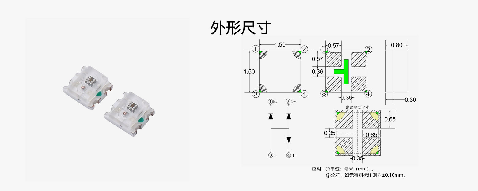 1515-0.8T AAV AAV.042.RGB 1.5*1.5*0.8 Green 绿光 515-525 2.7-3.5 200-400 120 IF=20 4000pcs/盘